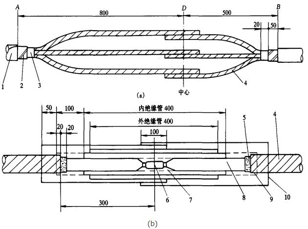 (6)纏四氟帶,固定隔油管、外絕緣管和半導(dǎo)管。按圖3-109 (b) 所示包繞四氟帶 300mm,將隔油管套在四氟帶上,由中心向兩端加熱固定。再將外絕緣管套在隔油管上,由中心向兩端加熱固定。將兩根半導(dǎo)管套在絕緣上,兩端搭接手套指端10mm,依次由兩端向中間加熱固定。